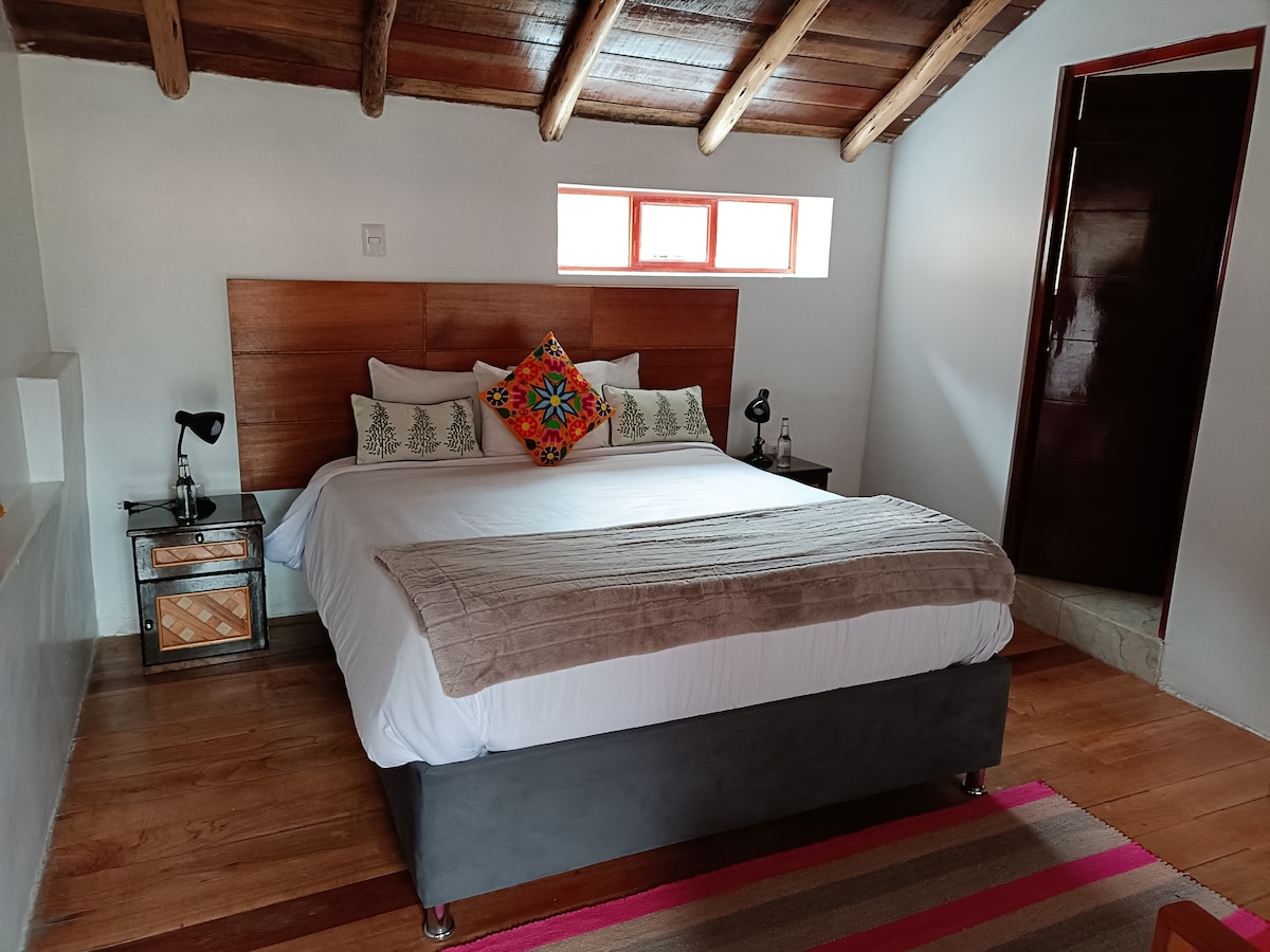 В комнате есть одна двуспальная кровать и одна односпальная кровать, гигиенические принадлежности в комнате. Личные принадлежности для уборки: 3 полотенца, рулон туалетной бумаги, два куска мыла, две шампунь-подушечки (в зависимости от количества гостей). Здесь есть свечи, настенная вешалка, стол (70 см х 70 см) С ДВУМЯ стульями, коврик. В ней есть ваза с копией местных цветов, две картины, сделанные художниками Куско.