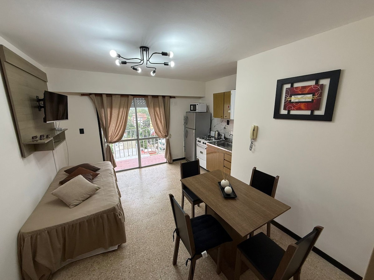 Очень полное Monoambiente c/ division в лучшей зоне Мар-де-Айо, с видом на море и в 100 метрах от торгового центра. Балкон с видом на море, полностью оборудованный для семьи до 4 человек. Двухместная кровать и гнездовая кровать. Кухня с прачечной ( морозильник, микроволновая печь, электрическая пава, тостер, соковыжималка, полная посуда и газовая плита). Wi-Fi, 42-дюймовый LED-телевизор с DIRECTV, DVD и мини-компонентом. Полная ванна. Спальные места, зонтик и пляжные игры.