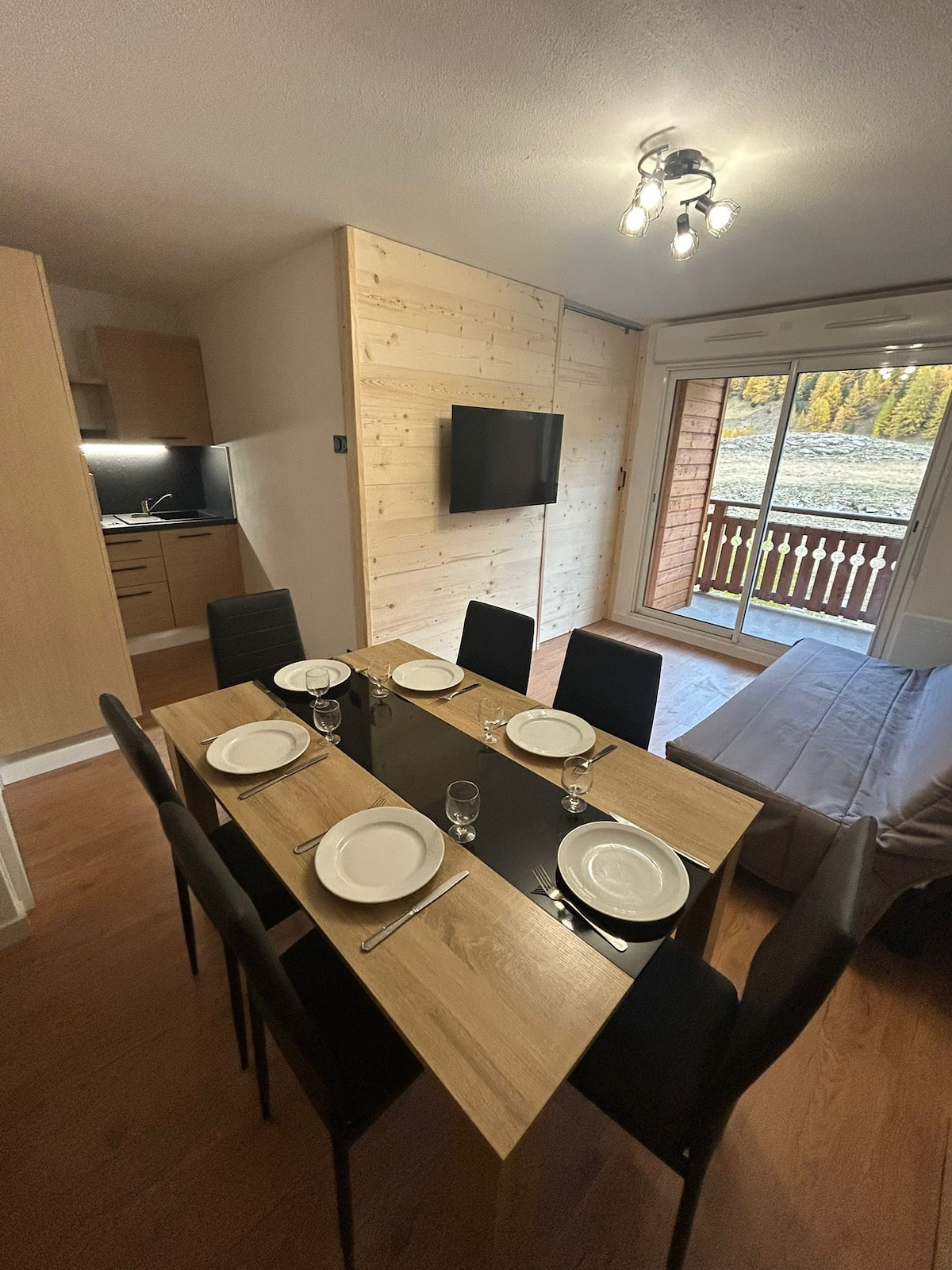 Терраса с южной стороны на 4-м этаже. Квартира вмещает 6 35 м2 100 м от склонов. -1 двухъярусная кровать 2X1 человека в горном уголке. -1 диван для одного человека + 1 раскладная кровать на 1 человека в гостиной. -1 двуспальная кровать 160 в комнате. - Квартира и полностью оборудованная кухня на 6 человек (посудомоечная машина/кофеварка/тостер/планча и т. д.). - предоставляются одеяла и подушки. - Телевизор - зона отдыха в резиденции, включенная в аренду (бассейн/хаммам/сауна), открытая сезонно.