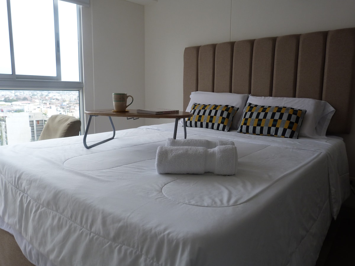 Отдохните в этой новой квартире в одном из лучших районов Лимы. У вас есть комфортабельные номера, горячая вода, первоклассная кухня со всем необходимым. 2 55-дюймовых и 40-дюймовых телевизора со СМАРТ-ТВ, Wi-Fi и новые кровати. Она расположена в безопасном и элегантном районе, напротив парка и недалеко от торговых центров, ресторанов, тренажерного зала, банков, университетов и кинотеатров. У нас есть кроватка, спросите о доступности