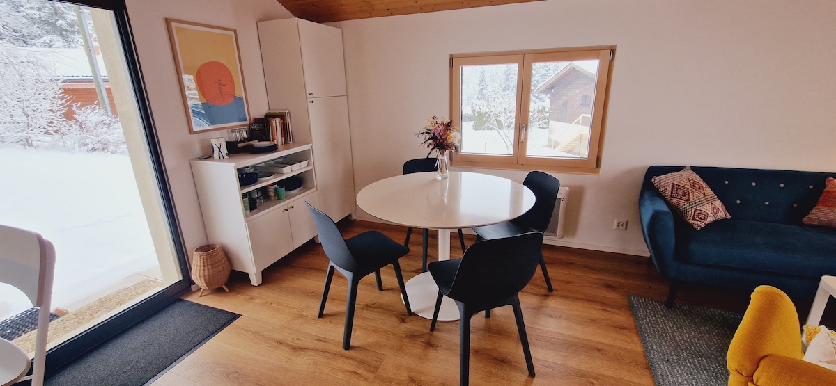 Шале Tiny House на 3 этажах полностью отремонтировано для семьи из 4 человек. - Главная спальня на нижнем этаже, ванная комната и туалет. - Гостиная (пеллетная плита) и открытая кухня на верхнем. - Удобная двуспальная кровать «общежитие» на чердаке для детей. Расположена над Сент-Черг у леса, тихо. Полюбуйтесь восходом солнца с видом на Женевское озеро и Альпы. Наслаждайтесь нашим просторным садом с барбекю, печью для пиццы, ванной на открытом воздухе и сауной.