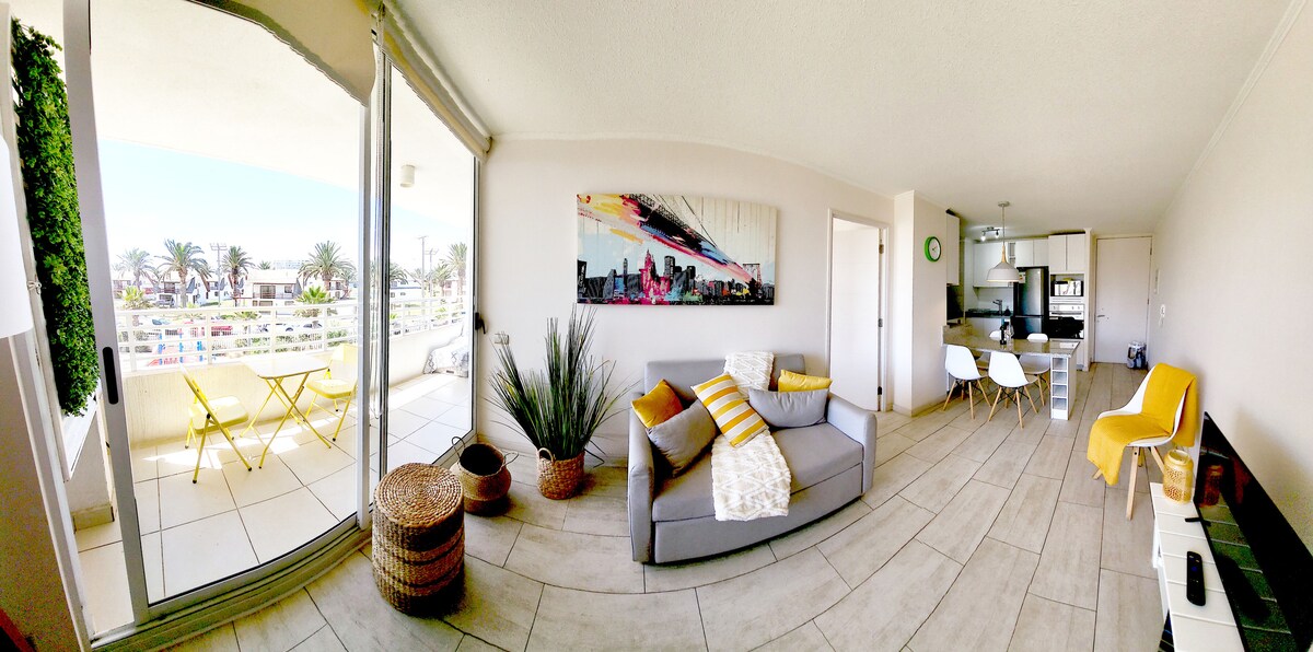 Квартира расположена на проспекте Авенида-дель-Мар в городе Ла-Серена, на третьем этаже, в 470 километрах от столицы Чили, Сантьяго. С террасы открывается вид на синеву моря и самые красивые закаты. У вас есть большой пляж, чтобы насладиться прогулками или купанием, и вы найдете очень близко хорошие рестораны и Cacino Enjoy de Coquimbo. Вы можете насладиться открытым бассейном и красивым лугом. В оборудовании квартиры в дополнение к двуспальной кровати есть диван-кровать.