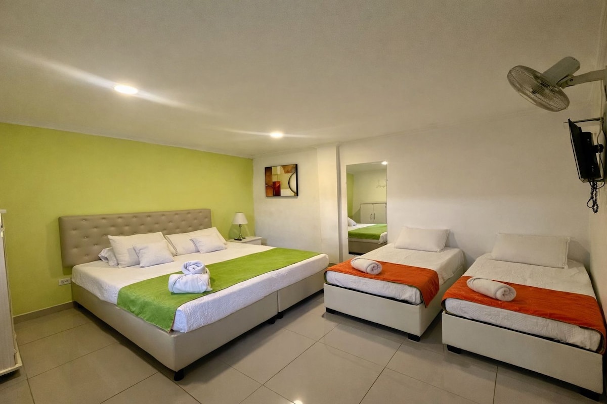 Семейная комната расположена в знаменитом туристическом комплексе Villa Bernal. Номер вместимостью до 3 человек (2 кровати). Отдельная ванная комната, телевизор. Насладитесь купанием в нашем бассейне, любуясь знаменитыми золотыми закатами Кофейного культурного ландшафта. Мы находимся всего в нескольких минутах езды от Кимбайи, Армении и Перейры, что позволяет легко добраться до тематических парков и многого другого. Насладитесь красотой и спокойствием Ульоа, кофейного сердца долины.