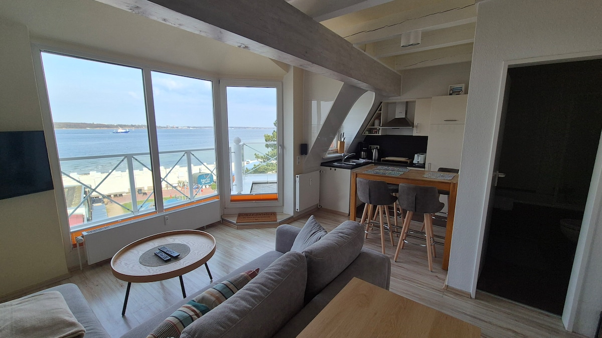Ferienwohnung Strandkoje: Haus "Hotel Panorama", 1. Reihe an der Strandpromenade mit Meerblick, Maisonettewohnung im 3. OG, ca. 40 m², für bis zu 3 Personen, kombinierter Wohnbereich mit Boxspringschlafcouch, Balkon mit Panoramablick über die Förde, offene Küche mit Essplatz, Dusch-/Wannenbad, offene Empore, separates Schlafzimmer mit Doppelbett in der oberen Ebene, Tiefgaragenstellplatz, Aufzug im Haus