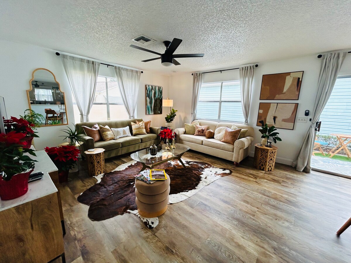 We love this home because the location is FANTASTIC! It's under a mile to Sumter Landing (walking distance for us :)). Also, new floors, paint, etc! The living room furniture is extremely comfortable! The kitchen has everything you need. The beds are comfortable and there is a tv in every room. (The second bedroom but needs your own Roku or Firestick!) There is a cart included which is the best way to see The Villages. We know you will love it here! Let us know if you have any questions.