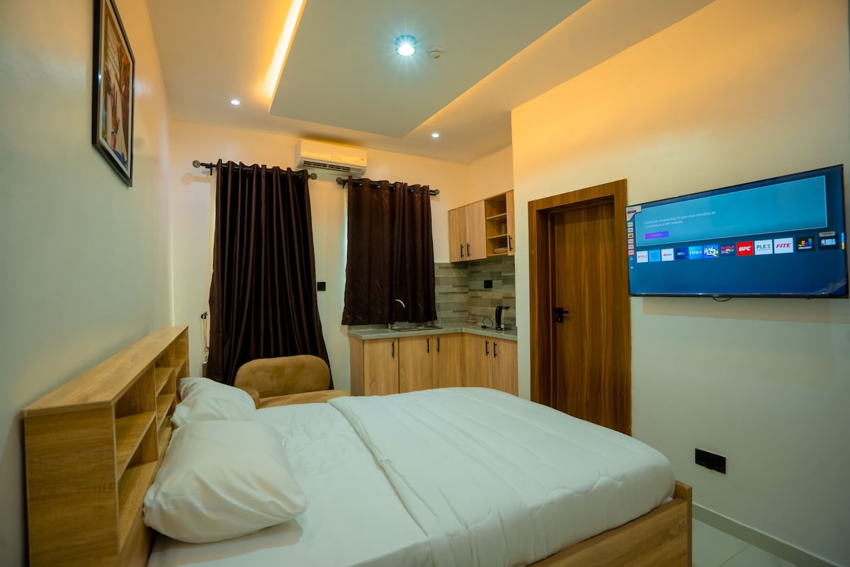 Современный пентхаус с 2 спальнями и 2 ванными в Алагомеджи, Яба. К услугам гостей элегантные спальни, частный внутренний дворик, высокоскоростной Wi-Fi, телевизоры 4K с DSTV и резервный генератор с поддержкой инвертора. Безопасное здание с круглосуточной охраной, цифровым входом и камерами. Прогуляйтесь до магазинов и ресторанов, с быстрым доступом к 3-му материковому мосту, острову Лагос, Икедже, Лекки и аэропорту Муртала Мухаммед. Доступен только нижний уровень; генератор работает с тяжелыми приборами, инвертор питает основные приборы.