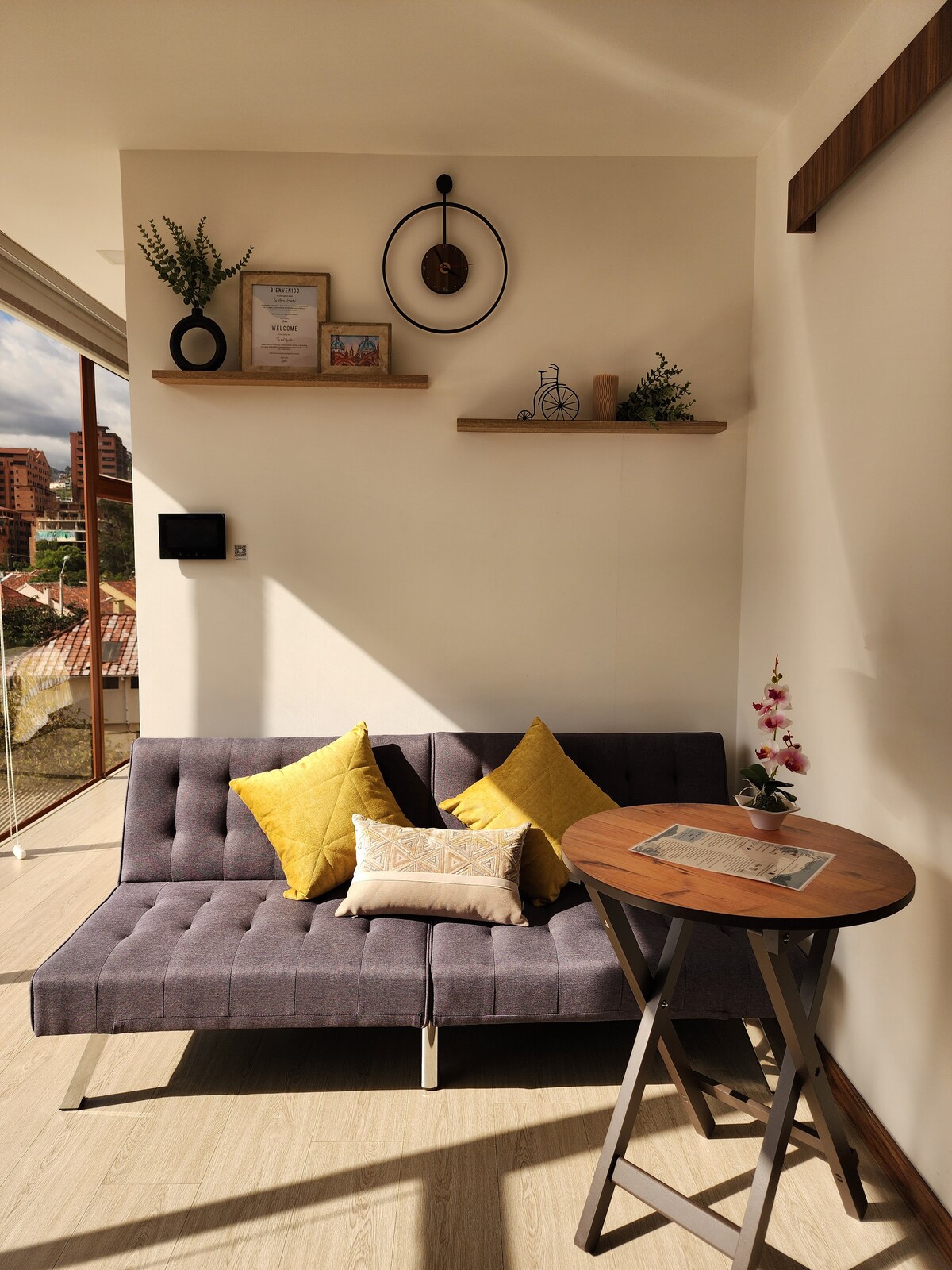 Поглотите тепло и свет гостиной открытой планировки с роскошными 9-футовыми потолками, 20-футовым сводчатым потолком с мансардным окном в общей/кухонной зоне и огромными окнами для спокойного, тихого и расслабляющего отдыха в Куэнке. ⚡️ Круглосуточная горячая вода, Wi-Fi и электричество для ваших устройств благодаря нашей резервной аккумуляторной системе. Примечание: некоторые мощные приборы, такие как фен и чайник, не работают во время отключения электроэнергии.