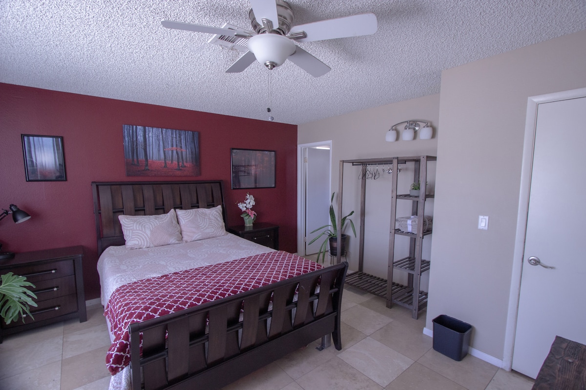 Новое жильеТихая главная спальня с двуспальной кроватью размера Queen size и ванной комнатой.