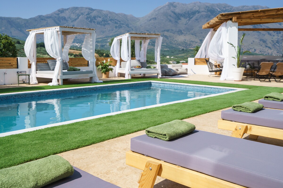 Secluded and soulful, MariAndry Villa offers an escape into nature’s embrace, making it the perfect setting for restorative retreats. Nestled in 17000m² of lush olive groves and Cretan wilderness, the Villa is only a short drive from the golden sands of Episkopi Beach, promises cherished sunlit afternoons, and starlit evenings. Complete with Private Swimming Pool, Outdoor Whirlpool, BBQ, Playground, 2 bedrooms & 2 bathrooms, this Retreat has been crafted with tranquillity and comfort in mind.