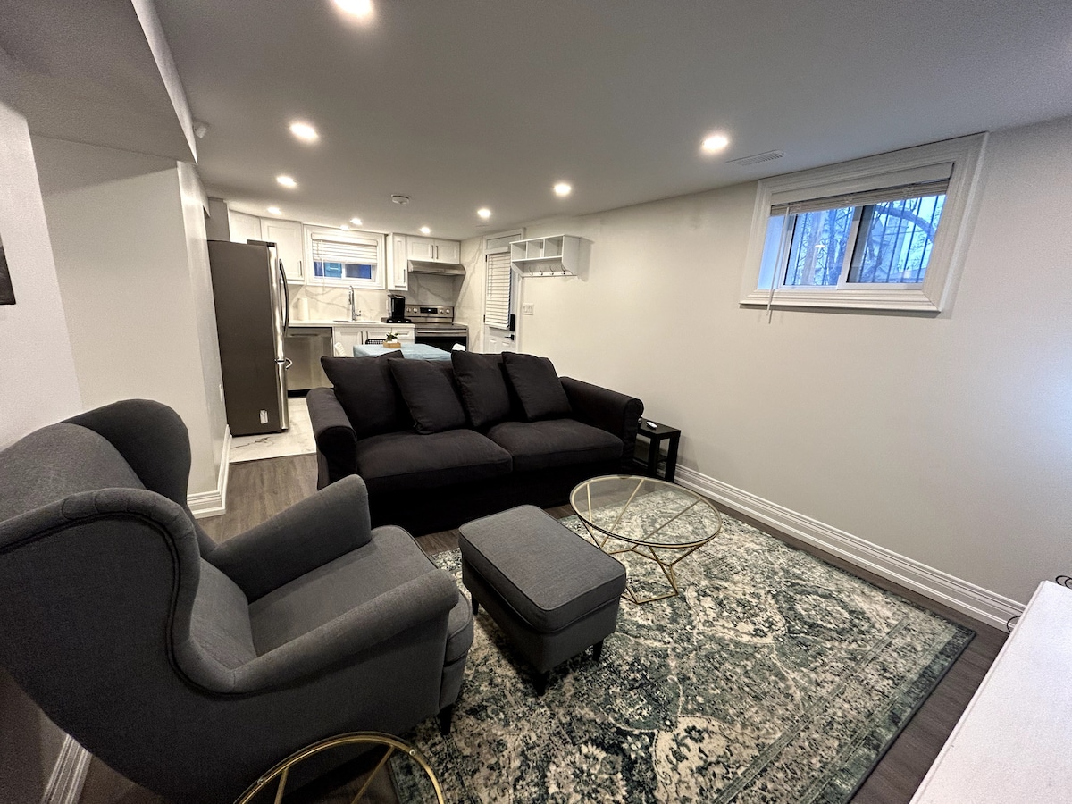 Красивые 2 спальни в подвале. Недавно отремонтированное и меблированное это просторное жилье вмещает 4 человек или 3 человека в каждой из них в собственной кровати. Расположена в 10 минутах ходьбы от железнодорожного вокзала Mimico GO. 1 минута ходьбы до трамвая Queen St. 15 минут езды до центра Торонто. 15 минут езды до аэропорта Торонто Пирсон. В нескольких шагах от ресторанов, баров, продуктовых магазинов, тропы у озера. Прачечная на территории. Wi-Fi, телевизор, обеденная зона - в этом месте есть все! Бесплатная парковка на подъездной дороге.