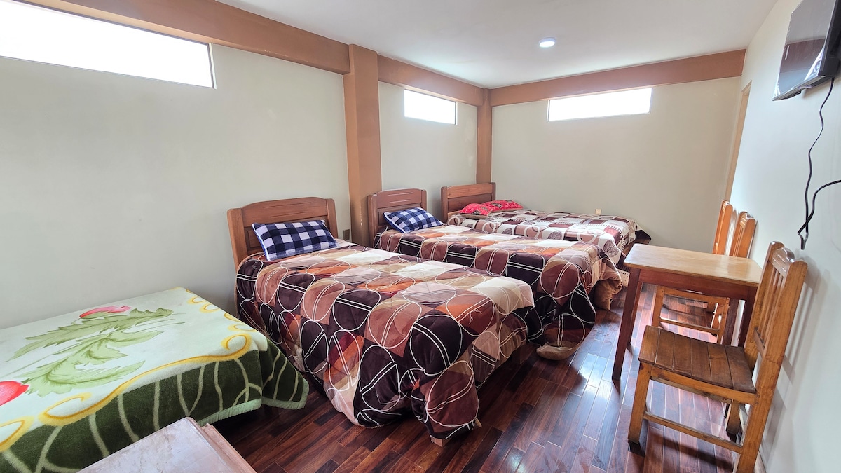 Наслаждайтесь комфортным проживанием всего в нескольких шагах от озера Титикака, в безопасном центральном районе с семейной атмосферой. Мы предлагаем номера с собственной ванной комнатой, Wi-Fi, горячей водой, кабельным телевидением и большим гаражом. Круглосуточная поддержка, гибкое время прибытия. Мы находимся в 1 квартале от рынка «Unión y Dignidad», рядом с главными проспектами и в 5 минутах езды от центра города. Мы также даем советы по экскурсиям. Забронируйте сейчас и насладитесь Пуно!