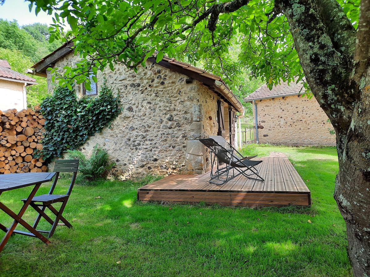 Calme garanti pour cette petite maison typiquement périgourdine, non isolée Le gîte: - rez de chaussée: cuisine ouverte: réfrigérateur, cuisinière (plaques induction), micro ondes, cafetière, grille-pain. salon avec canapé convertible en cas de chaleur - étage: chambre et salle de bain/wc, mansardés, sous poutres avec accès par escalier meunier, donc non adaptés pour des personnes à mobilité réduite, fer et planche à repasser - salon de jardin, transats et parasol