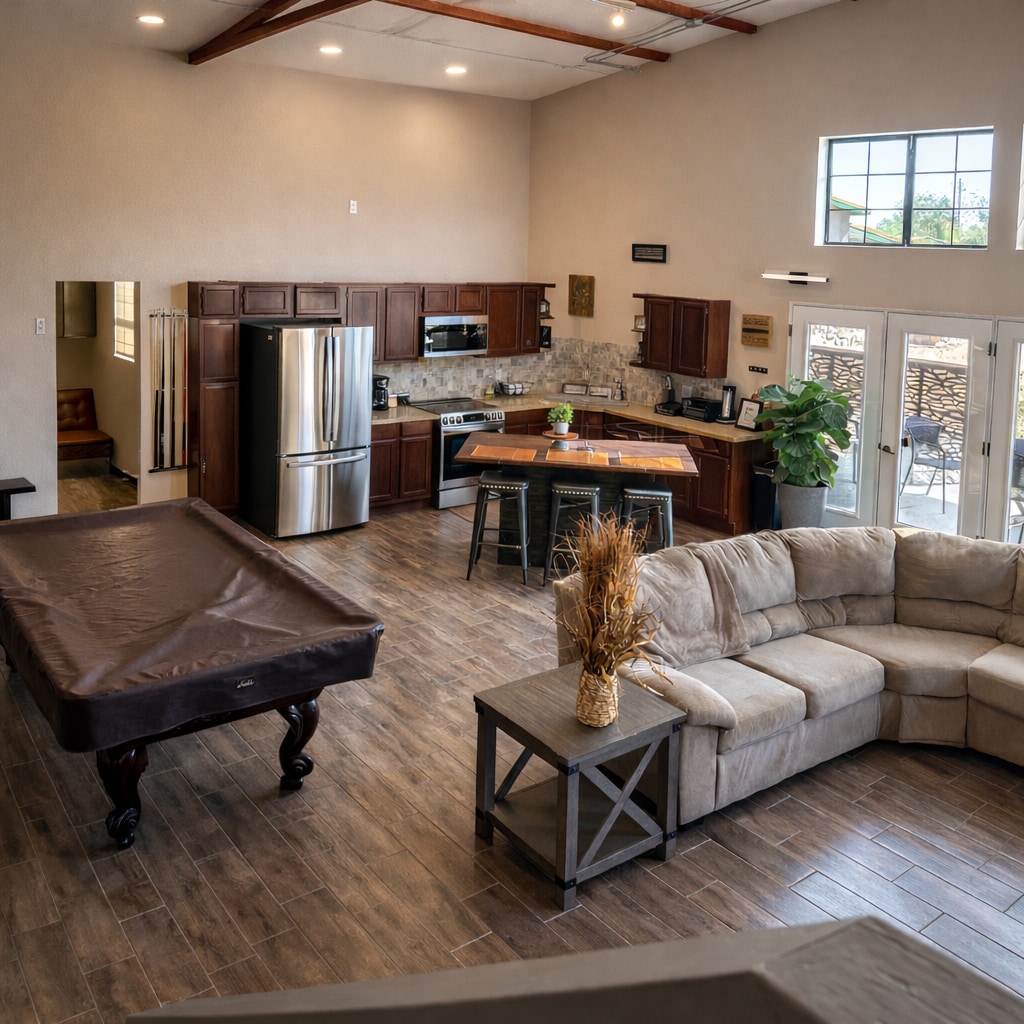 В доме есть удобная открытая планировка с большим количеством мест для отдыха на кухне, барной стойкой и обеденным столом. На этой кухне есть красивая бытовая техника с длинным островом и нержавеющей стали с посудой, кастрюлями, сковородками, посудой, машиной Keurig. В доме есть 3 кровати размера Queen size и комната для офиса с рабочим столом или игровой комнатой для детей. ВЫСОКОСКОРОСТНОЙ WI-FI с XFINITY. Лежащие диваны в гостиной. Шопинг и множество ресторанов, Red Hawk Golf, Parks, Fitness One, White Sands поблизости.