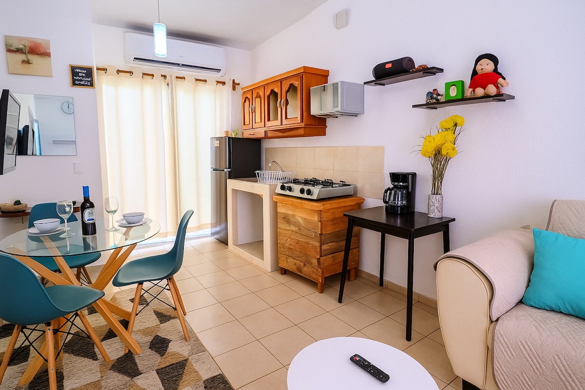 Apartamento María es moderno y acogedor, perfecto para quienes buscan comodidad, buena ubicación y un espacio para relajarse. Cuenta con aire acondicionado, una sala de cine ideal para disfrutar películas y series después de un día de actividades. Está ubicado cerca de centros comerciales, restaurantes y del corazón de Santa Ana, lo que facilita moverse por la ciudad sin complicaciones. Ideal para parejas, viajeros de descanso o trabajo que desean un lugar tranquilo, limpio y bien equipado.