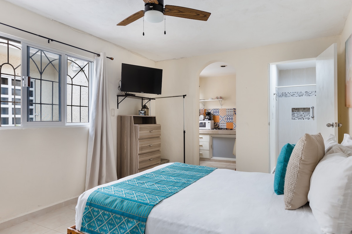 Замечательная студия для одного-двух человек(не детей) в центре города и тихом районе Канкуна. Удобная, яркая и очень красивая(новая). В нем есть все необходимое для вашего пребывания в Канкуне: телевизор с кабельным телевидением и Netflix, кондиционер, Wi-Fi, мини-кухня с холодильником, бассейн, верхняя крыша и другие удобства. В нескольких минутах ходьбы находятся коммерческая площадь, ресторан, магазины и общественный транспорт, которые находятся в двух кварталах от гостиничной зоны и общественных пляжей. Все, что нужно, чтобы чувствовать себя как дома.