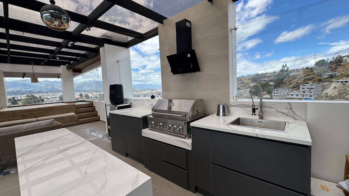 Vive una experiencia única en Latacunga, en una suite moderna con acceso exclusivo y un rooftop panorámico con vista al imponente Volcán Cotopaxi y a toda la ciudad ✨ Hidromasaje con vista panorámica, 🔥 Parrilla moderna a gas, perfecta para disfrutar una cena especial 🌿 Área verde descubierta 🌉 Puente de vidrio Perfecta para una escapada en pareja, una celebración de aniversario, o una reunión privada con amigos en un entorno moderno y tranquilo.