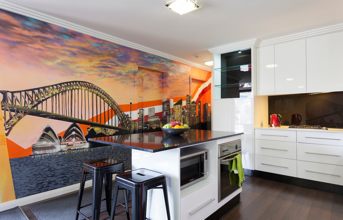 Добро пожаловать в мою светлую и просторную студию, расположенную в одном из самых спокойных пригородов Сиднея. Насладитесь ПОТРЯСАЮЩИМ видом на гавань и оперный театр, приготовив блюда на современной, полностью оборудованной кухне или отдохните на балконе с любимым напитком. У вас будет удобная двуспальная кровать размера Queen size, а также внутренняя прачечная. В двух минутах от паромов Harbour идеально подходит для гостей, которые хотят оставаться рядом с городом, но ищут тихую студию с фантастическим видом.