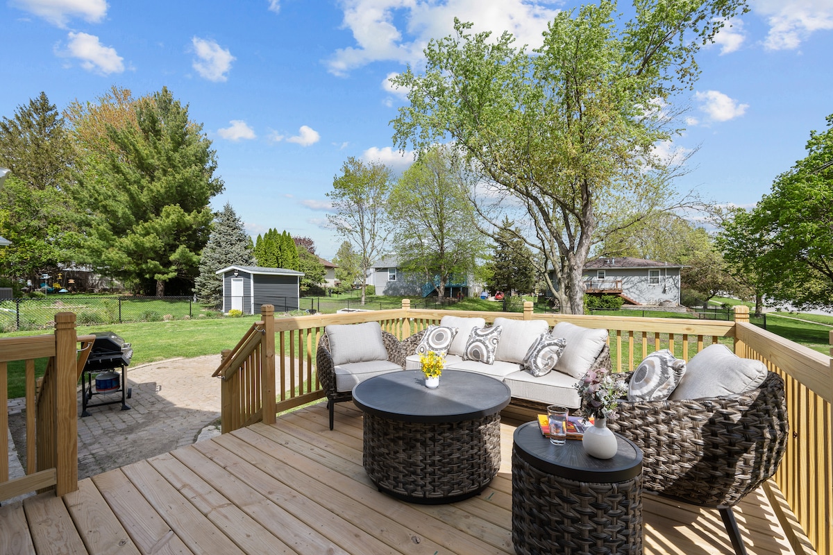 🍂 Cozy up by the firepit and watch stunning sunsets over the Rock River. Enjoy crisp fall air from your private deck, complete with kayaks, bikes, and peaceful water views. This eclectic cabin bungalow offers vibrant décor, cozy living spaces, and a large wrap-around deck perfect for relaxing. Just steps from the water and close to shops and restaurants, it’s a serene riverside retreat for couples, families, and friends.