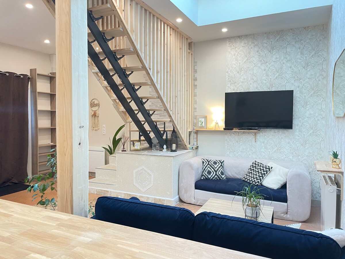В земле Жорж Санд вы будете размещены в светлой квартире площадью 37 кв. м, в которой могут разместиться до 4 человек(в одной спальне и на диване-кровати),расположенной в центре La Châtre. Рядом есть бассейн, музей,удобства и частная парковка (около 600 кв. м). Для вашего пребывания вам будет предоставлено постельное белье и полотенца, в жилье есть оптоволокон.