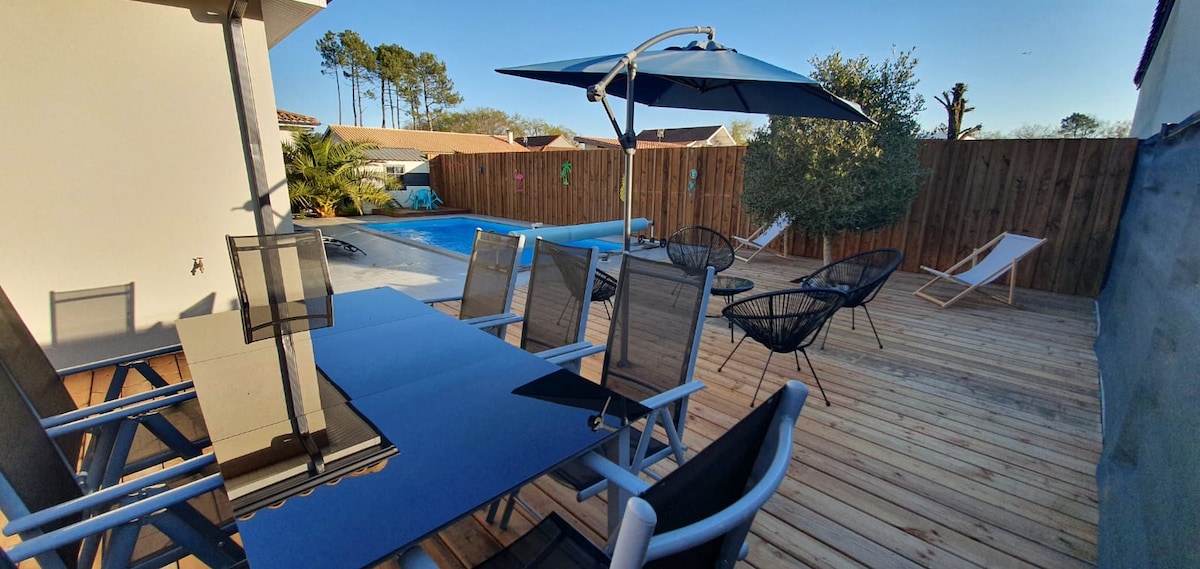 Profitez de la douceur du bassin d'Arcachon dans l'agrandissement de ma maison Au programme balades au parc ornithologique, ports du Teich, de Gujan Mestras... les sentiers du littoral, 14 km d'Arcachon, 18 de la dune du Pyla et des plages océanes La maison est composée à l'étage d'un salon télé et bureau avec wifi En bas deux chambres (avec lits en 140) une salle d'eau et un toilette séparé Pour finir une cuisine tout équipée avec accès à la terrasse Salon de jardin, piscine 1, coin détente.