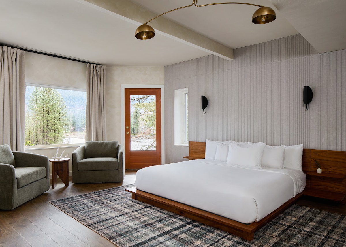 Камин - такое уютное место, чтобы свернуться калачиком, а большие кресла с темой дикой природы расположены идеально, чтобы увидеть удивительную реку Венатчи и лесистую местность прямо за большими окнами. В Юконе есть частный доступ к тихой зоне отдыха или дорожкам для прогулки на природе у красивой реки, когда она протекает прямо мимо гостиницы. В люксе, предназначенном в первую очередь для пар, есть мини-кухня с мини-холодильником, микроволновой печью и Keurig. Подходит для собак.