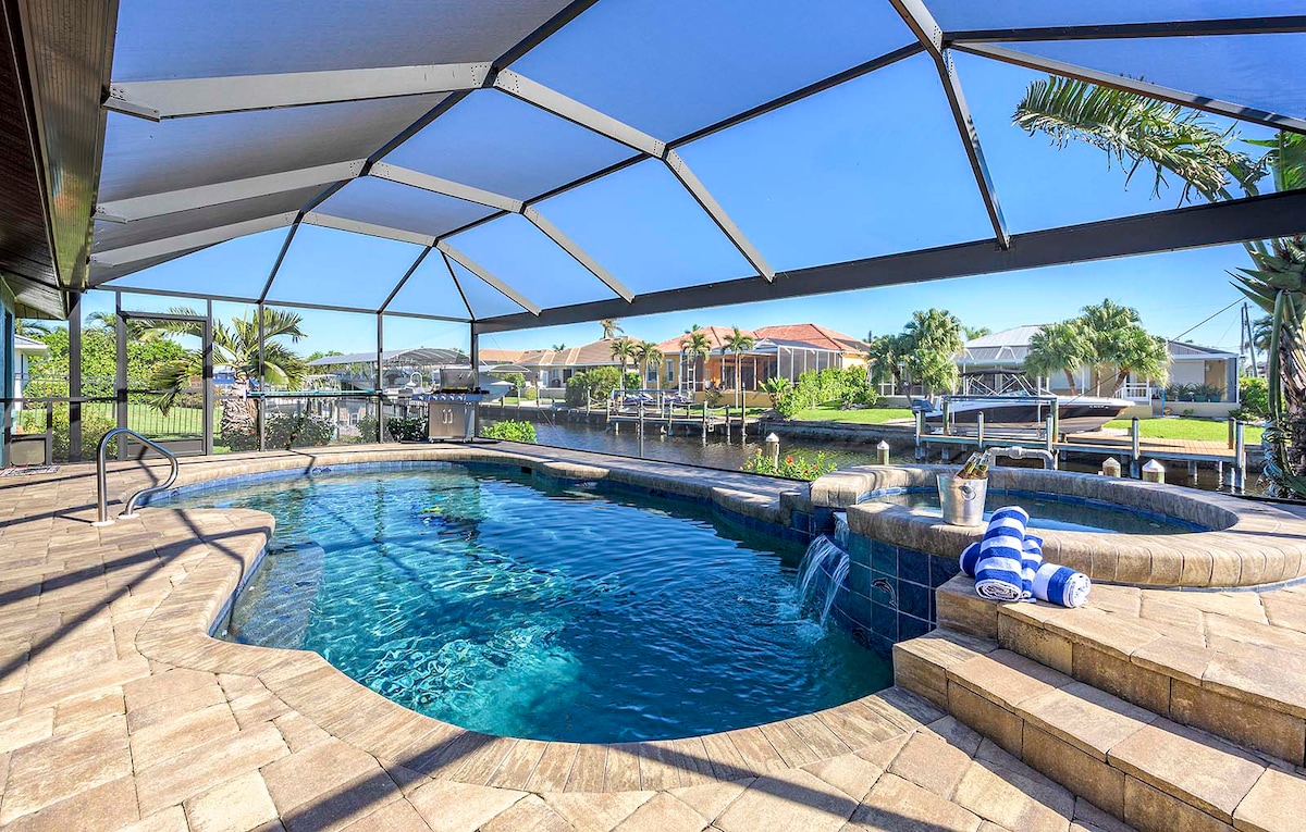 This spectacular 2358 sq. ft. Cape Coral waterfront home will exceed your expectations with its luxurious updates and abundant amenities. Located in a quiet neighborhood, but within minutes to shopping, grocery, restaurants, and beaches! Enjoy a large lanai with a heated pool and spa, outside TV and built-in grill. Includes kayaks, fishing poles, beach items, stroller, private driveway parking, Wi-Fi and printer. Gulf access with boat dock.