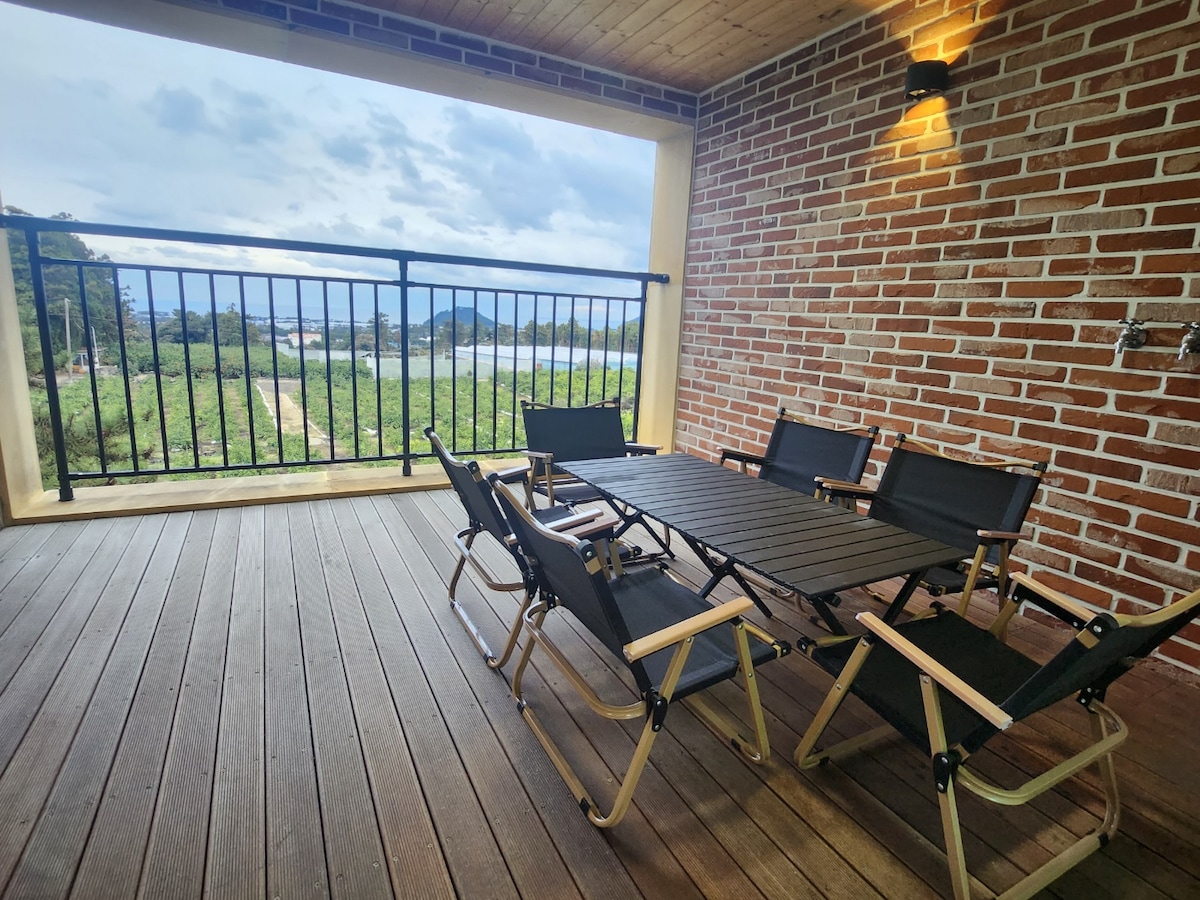 There are 2 bedrooms and a bathroom on the 3rd floor. A bedroom, a living room, and a kitchen are on the 4th floor. The rooftop garden is on the 5th floor. You get a scenic view of the ocean and an island in front, Mt. Halla at the back with the Seog
