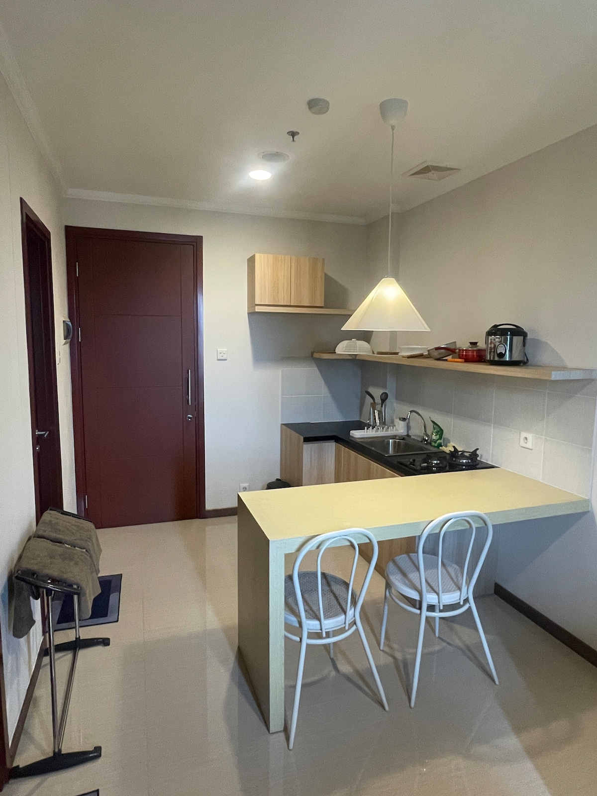 Наслаждайтесь стильным отдыхом в центре города, рядом с развлекательными заведениями, магазинами и местами для отдыха Удобства в номере - 1 двуспальная кровать размера King size - Wi-Fi + Netflix — Водонагреватель - Холодильник - Диспенсер - Кондиционер - Телевизор - Туалетный столик - Фен - Утюг - Кухня и кухонные принадлежности Удобства в здании - Бассейн - Тренажерный зал - Кафетерий - Мини-маркет * Индомарет * Круглосуточный магазин Cirkel K - Парковка (платная) - Прачечная Развлечения и покупки - Aeon Mall - ice bsd - The breeze bsd - Q big Mall