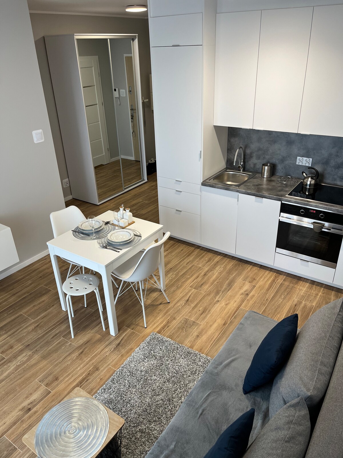 Квартира расположена на 3 этаже квартала с лифтом. Оснащена всеми необходимыми аксессуарами для функционирования: кухонным оборудованием, стиральной машиной, утюгом, сушилкой. В спальне стоит большая двуспальная кровать. В комнате с мини-кухней двухспальный диван-кровать со спальной функцией. Квартира рассчитана до 4-х человек. До центра Гданьска (5 км) можно доехать за 8 минут на машине. Рядом с квартирой (500 м) есть автобусная и трамвайная остановка. До аэропорта (12 км) всего 10 минут на машине.