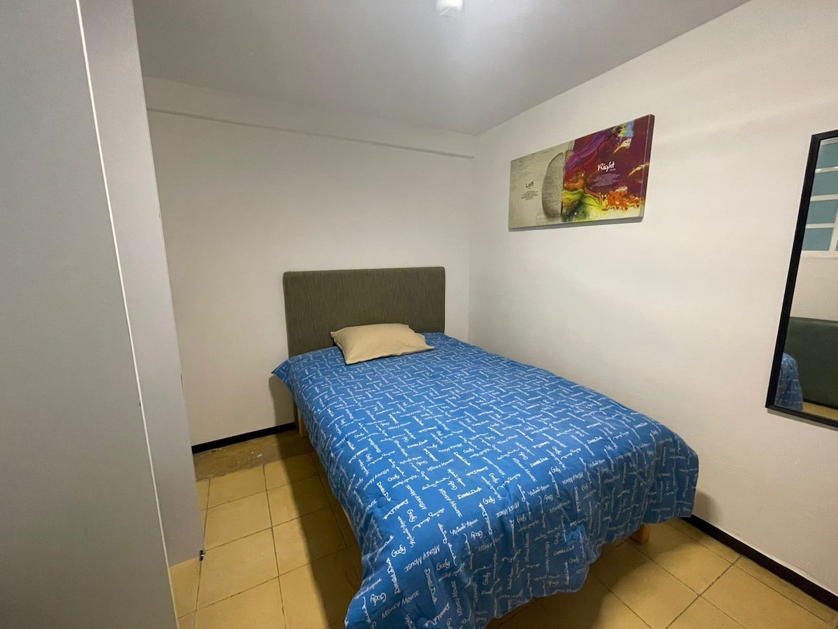 Вам понравится жить в этом независимом жилье с 2 спальнями и полной ванной комнатой в привилегированном и безопасном районе в 5 минутах езды от Полифорума в районе кафе, тренажерных залов, ресторанов хорошего уровня, исторического центра. Спальня 1: одна кровать размера Queen size. Спальня 2: 1 односпальная кровать, 1 двуспальная кровать, 1 диван-кровать. С 22:00 до 7:00 тихий режим для комфорта соседей. Красивый жилой район, идеально подходящий для прогулок Мы находимся очень близко к Poliforum и Foro Mazda, где проходят концерты.
