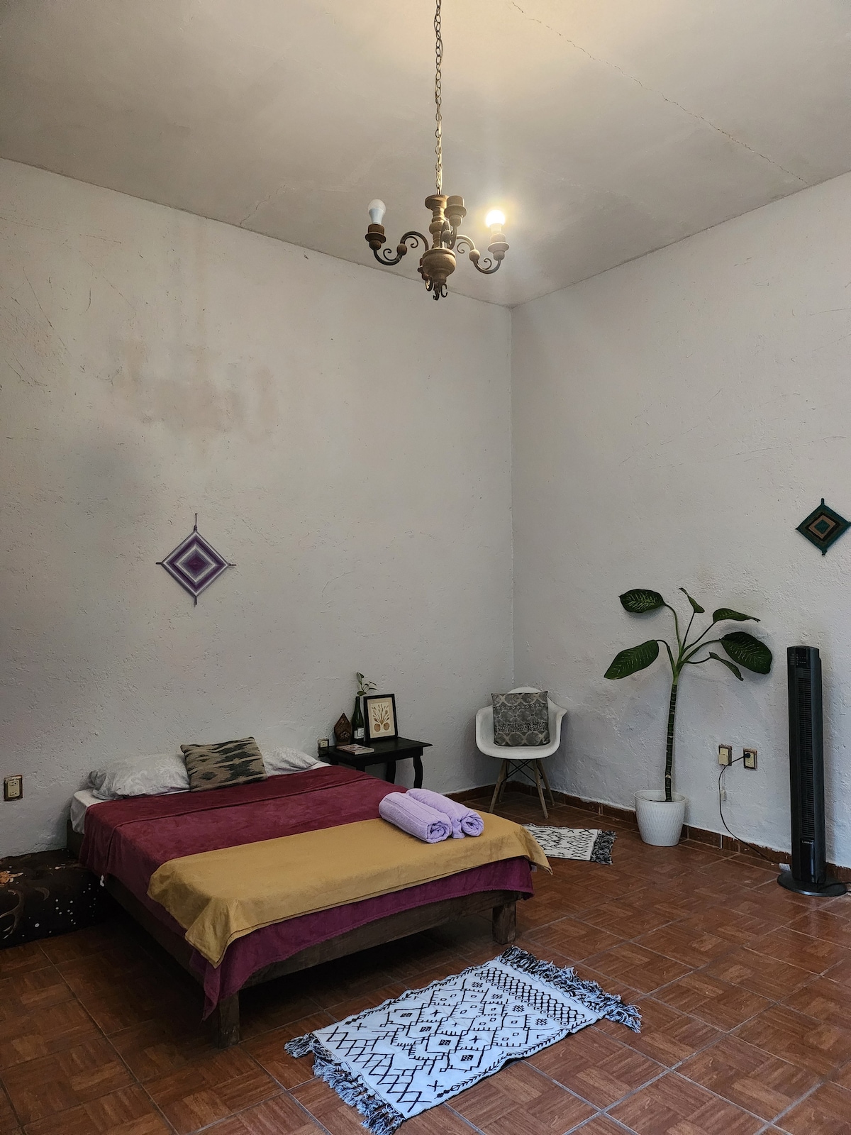 Habitación básica con cama matrimonial para huéspedes en lugar seguro, cerrado, con acceso a internet de alta velocidad. Estacionamiento dentro de la propiedad. Nos encontramos a 10 minutos del aeropuerto internacional del bajío a las afueras de la ciudad de Léon.