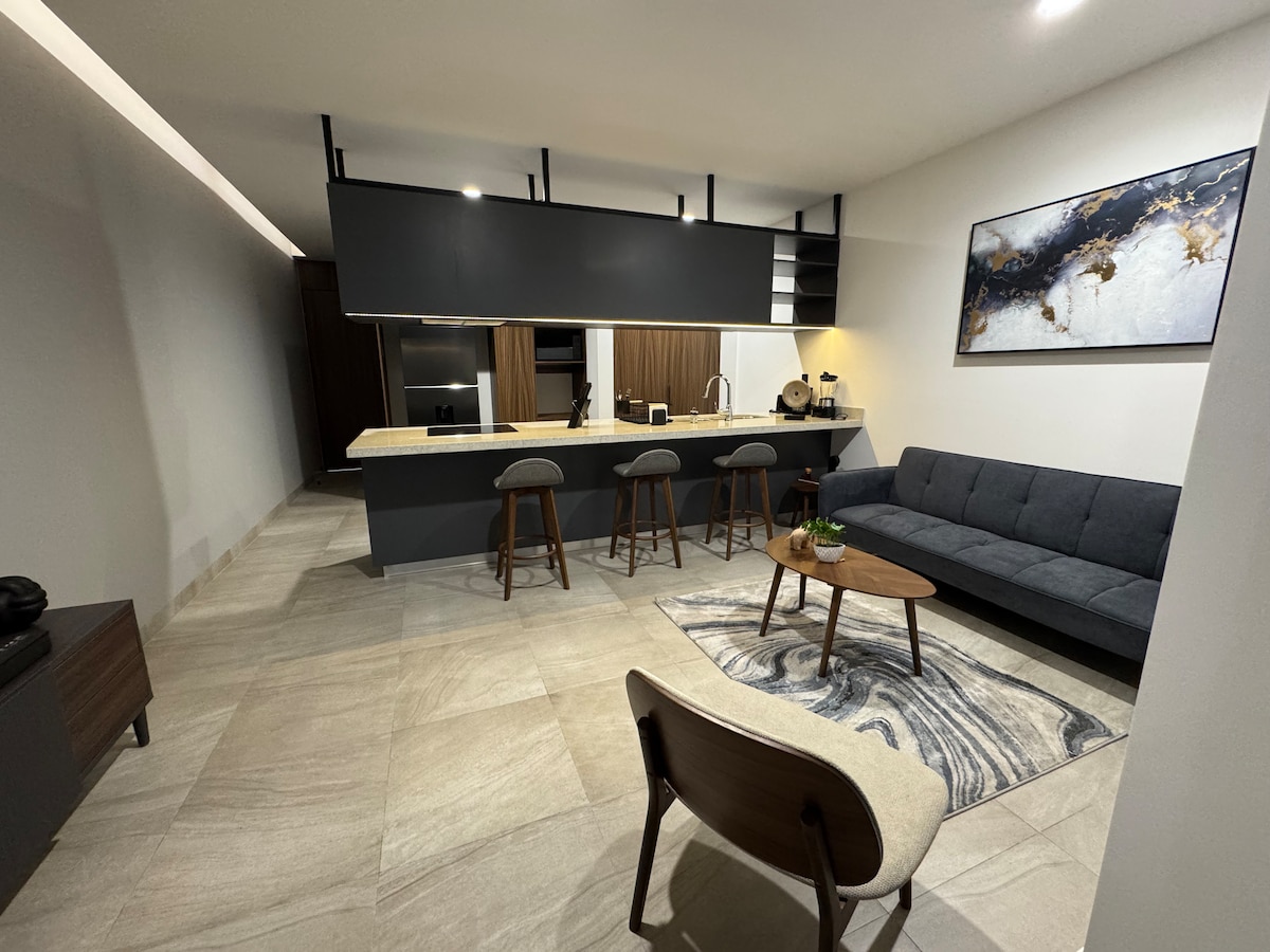 Moderno Departamento en el piso 19 con vistas panorámicas. Disfruta de atardeceres únicos desde sus terrazas privadas, El espacio cuenta con cama matrimonial, un baño y medio, walk in closet, cocina equipada, centro de lavado, internet de alta velocidad, así como amenidades de lujo: Piscina, Gimnasio, Jacuzzi y Sky View. Ubicación estratégica cerca de restaurantes y comercios.