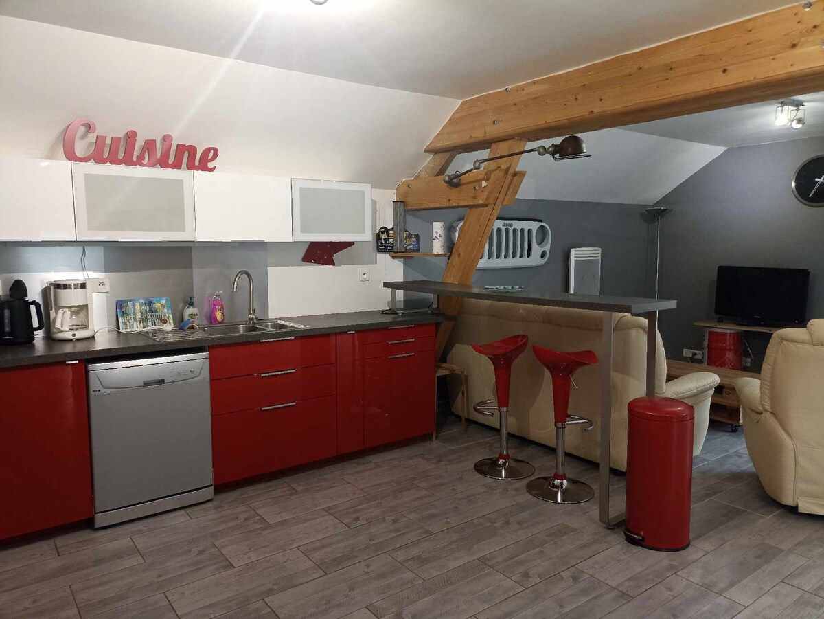 Beautiful industrial loft totaly restaured. Located in our house, the loft is completely private, you share the entrance hall and the backyard with us. The loft features 1 kitchen 1 huge bedroom with a 1m80 width bed and a mezzanine with the sitting-room view. There is a also a cosy reading corner and a beautiful brand new bathroom with an italian shower. 65 square meters in total with air conditioning. Access to the jacuzzi is optional for 20€ bathrobes included.