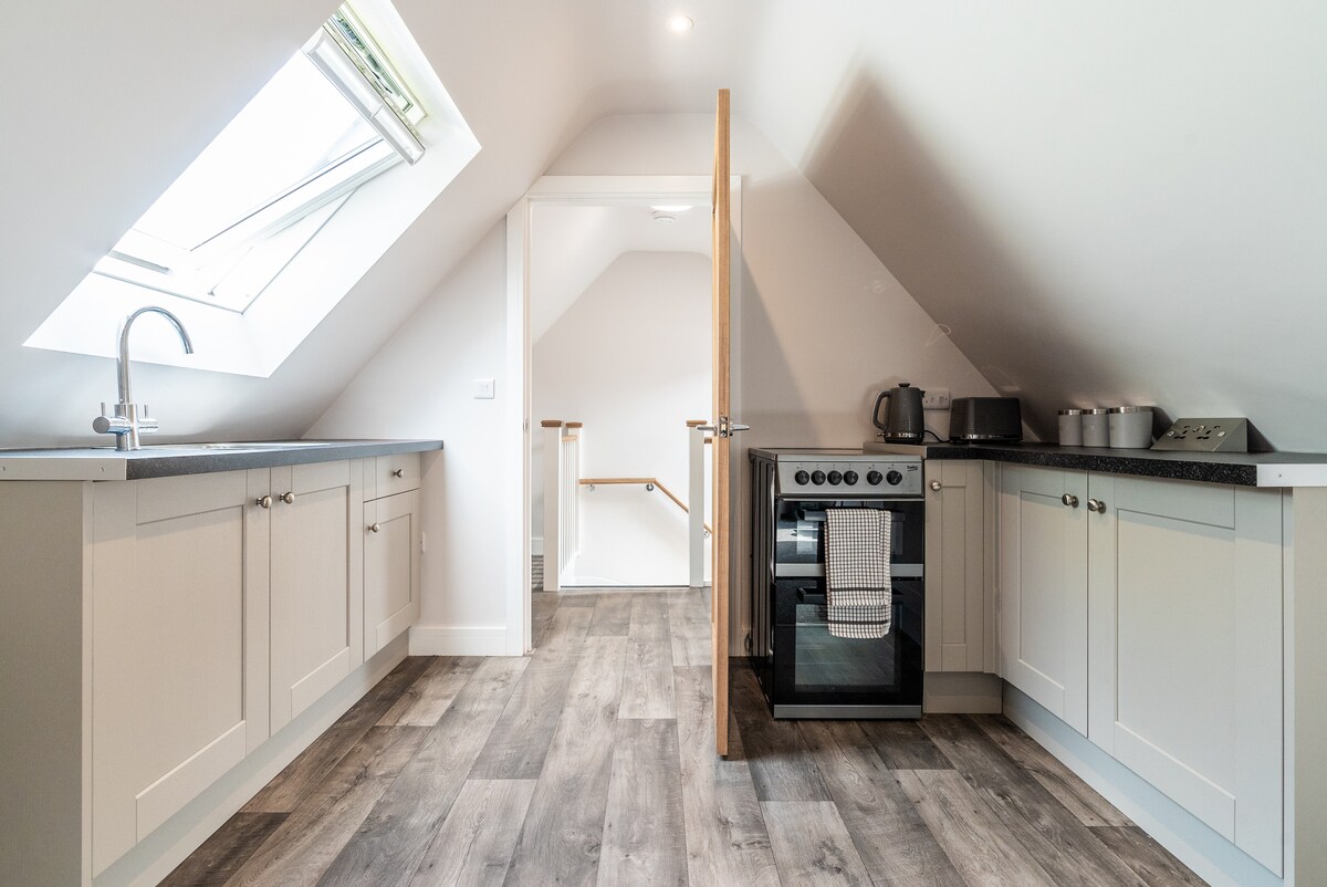 Просторная пристройка с одной спальней, собственной кухней и душевой. Доступ через собственную дверь (не забудьте о голове!), небольшой вестибюль ведет в кухонную зону, душевую комнату и в большую спальню, обращенную на юг, с высокими потолками и большими окнами с видом на переднюю лужайку главного дома. Расслабьтесь на удобном диване или наслаждайтесь едой за обеденным столом. Полностью оборудована для краткосрочного или длительного проживания. 20 минут пешком по полям до паба The Farmer's Dog.