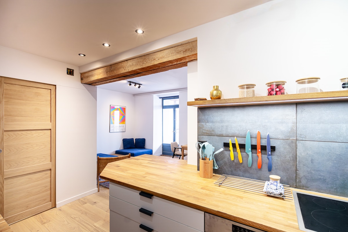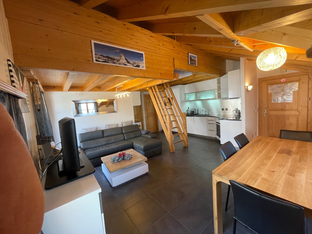 3,5-комнатная пентхаус площадью 70 кв. м на 3-м этаже с лифтом, вмещает 4 человека. К услугам гостей гостиная - обеденная зона, камин, Wi-Fi, телевизор. Кухня оснащена керамической плитой, духовым шкафом, посудомоечной машиной, чайником, набором фондю и набором раклет. Есть одна спальня с двуспальной кроватью (2x90x200), одна спальня с двуспальной кроватью (clic-clac 140x200) и одна кровать (90x190). В квартире также 3 балкона.