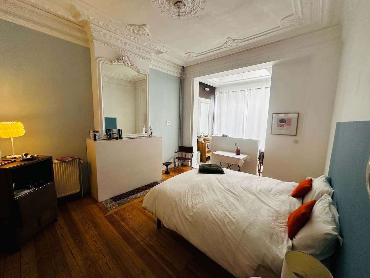 Большая студия, удобная и уютная современная и совершенно новая кухня. Отличное постельное белье с двуспальной кроватью размера King size (может быть односпальными кроватями), отдельная ванная комната, итальянский душ. Академия гольфа в 25 метрах. Загородная обстановка,недалеко от центра Льежа (15 мин). от спа-салона Francorchamps (20 минут). от Сарт-Тилмана (10 минут) и до Арденнских ворот. Рай для велосипедистов и пешеходов Отдельный вход-парковка - Терраса - барбекю. Nespresso,холодильник, микроволновая печь,телевизор,Wi-Fi. Рестораны,магазины в 500 м На английском и голландском языках