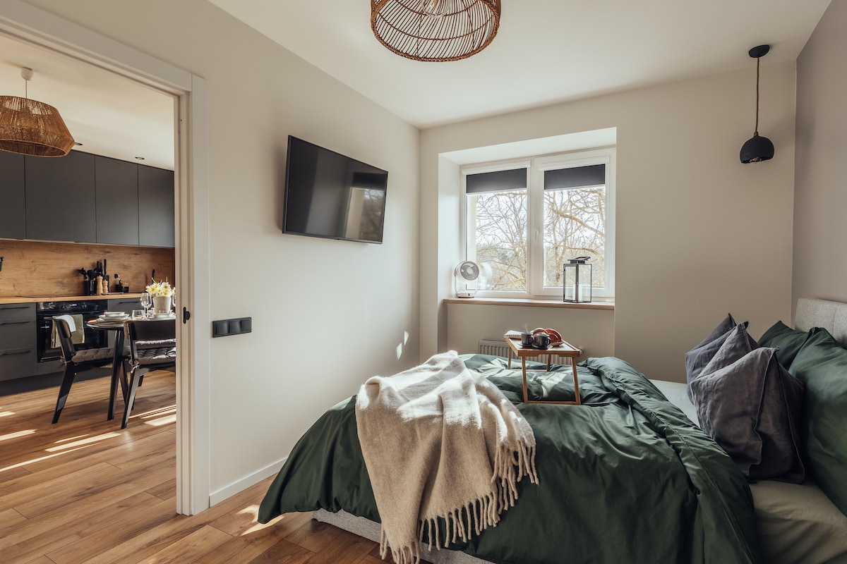 Уютная и светлая дизайнерская студия в центре Лиепаи с двуспальной кроватью размера king size, обеденной зоной, полностью оборудованной кухней. Я уделяю большое внимание чистоте – большинство гостей оценивают студию как сверкающе чистую. Студия выглядит точно так же, как на фотографиях. Просторная, современная лестничная клетка. Все здание было полностью реконструировано в 2020 году.