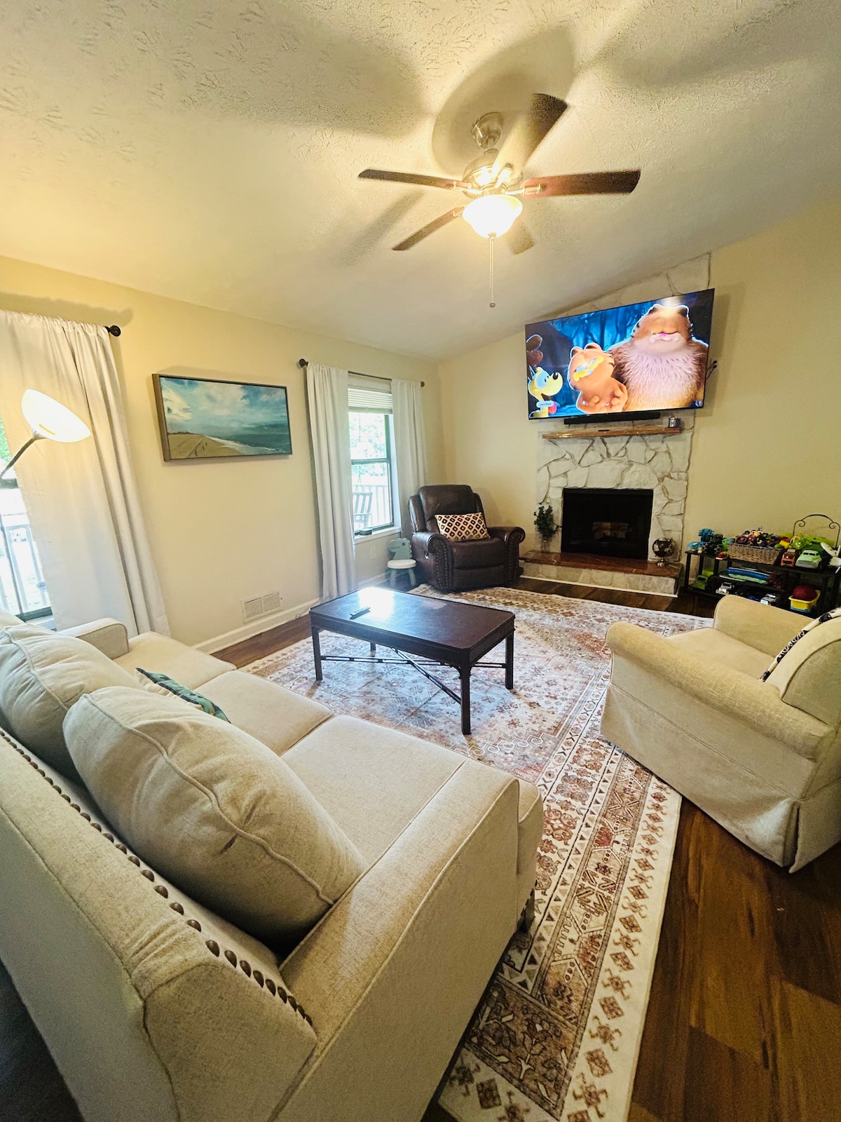 Расслабьтесь с семьей в доме амбара! Она расположена в тихом, спокойном районе всего в нескольких минутах ходьбы, таких как шопинг или пешие прогулки. В главной спальне установлена кровать размера Queen size, а в двух других спальнях — двуспальная кровать. Нет ни стиральной, ни сушильной машины! Пожалуйста, ознакомьтесь с нашим списком удобств для получения дополнительной информации о предметах и предметах первой необходимости, которые мы предлагаем для вашего пребывания.