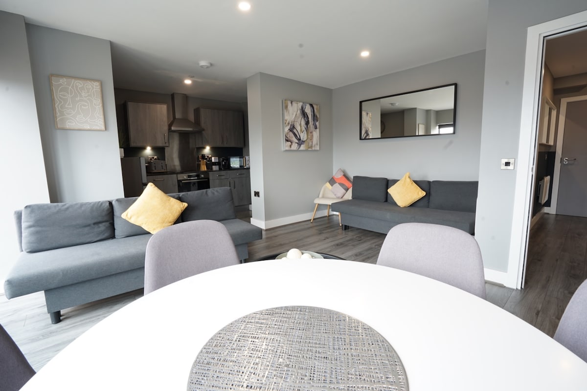 STRICTLY NO HENS/STAGS/PARTIES Modern 2 bedroom apartment, one double bed and one smaller double bed. Lounge area with dining table/ workspace. Luxury bathroom. Max 4 guests. Located in a residential complex in the heart of Liverpool's famous Liverpool One shopping centre . Central for all attractions : the Cavern Quarter, the Royal Albert Dock and historic buildings. City centre shopping, bars and restaurants are within easy walking distance. Ideal base for families, couples and professionals.