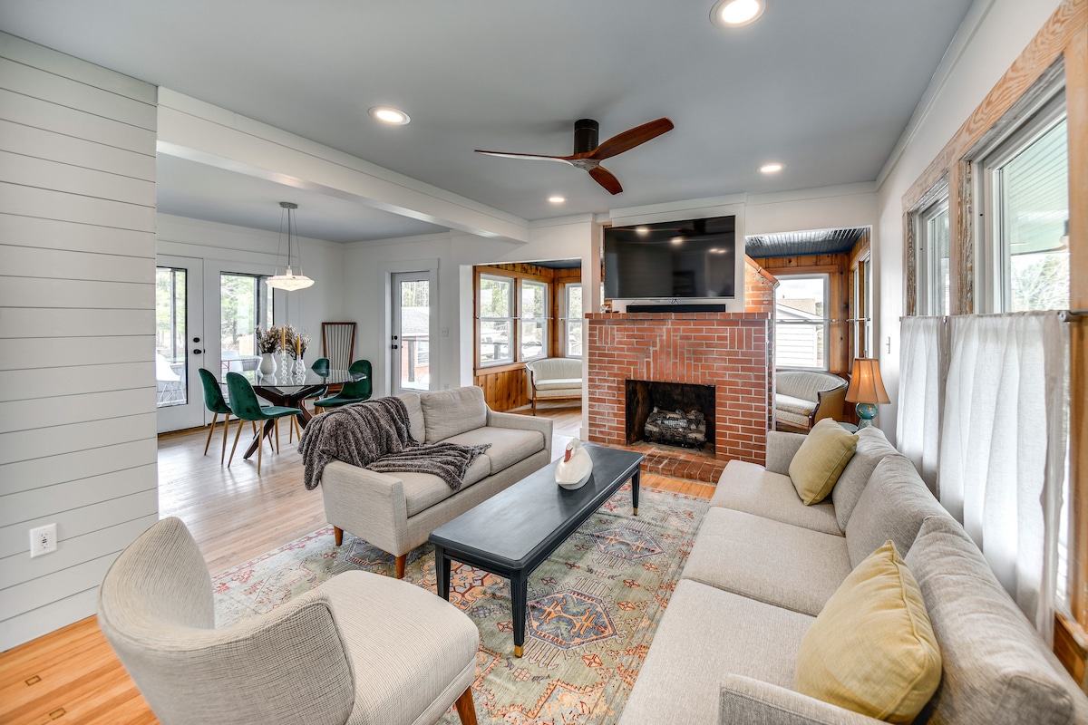 Heartsong Farmhouse was completely renovated in 2019. Beautiful hardwood floors, brand new furniture, in a modern farmhouse style with a Boho vibe. The entire home is filled with beautiful natural light and the brick walls ensure a peaceful nights sleep. The yard is completely surrounded by a 15ft hedgerow of holly, magnolia and camellias, like walking into a secret garden. You will feel welcome from the moment you drive up. The Farmhouse is also beautifully decorated for the holidays.