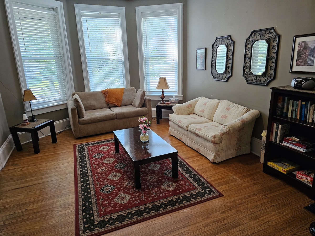 В этом комфортабельном жилье есть все удобства собственного дома. Не стесняйтесь пользоваться меблированной кухней, купайтесь в душе/ванне. Предоставляются полотенца и мыло и полотенца предоставляются Или просто расслабьтесь в гостиной, наполненной солнцем, Wi-Fi и 65-дюймовым телевизором Smart TV. В нескольких кварталах от магазинов, ресторанов, развлечений, набережной Миссисипи и всего, что есть в Берлингтоне. Прогуляйтесь (1 квартал) до потрясающего вида на парк Москитов. Из парка открывается потрясающий вид на Миссисипи, когда он впадает в район Берлингтона.
