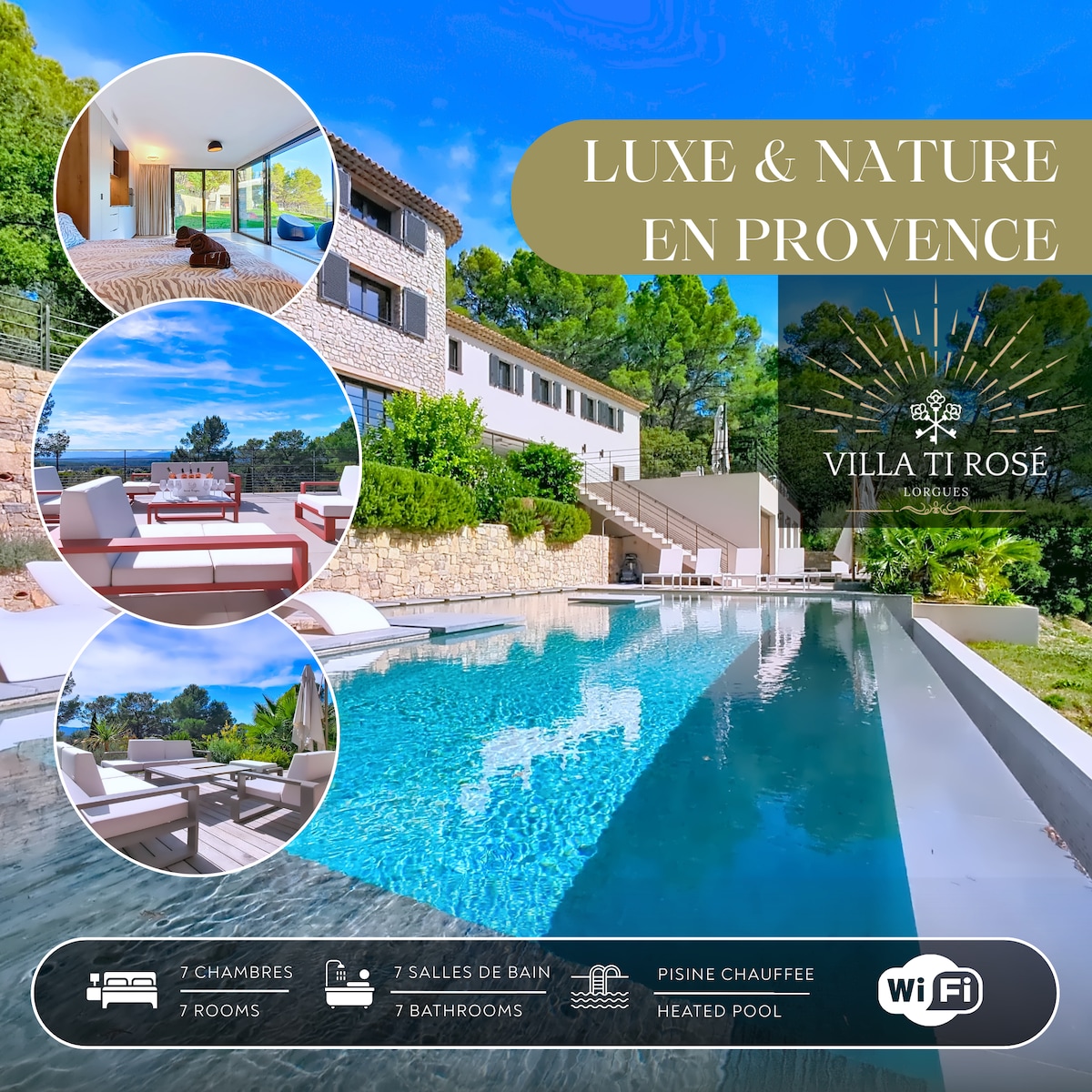Modern provencal luxury with Boho chic style. 5 bedrooms and 5 bathroom with 1 guest bathroom. Rustic and well maintained magical garden. Fiber internet. Ac and Television in every bedroom. 2 large TV 1 for gaming 1 for adults in common area. AC in common spaces. Very large garden with 2 different parts to the garden allowing 2 different social spaces. la villa n'est pas accessible aux personnes à mobilités réduites.
