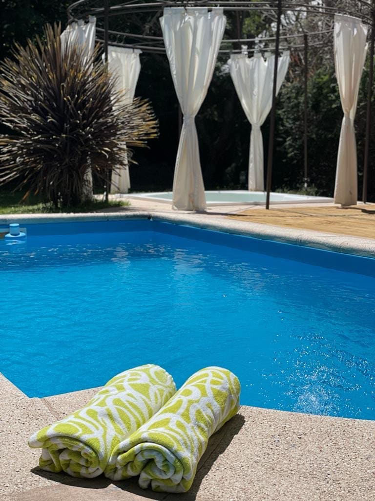 Отличный дом со всеми удобствами и оборудованием ,с качественными и удобными деталями. Идеально подходит для тех, кто хочет отдохнуть и отдохнуть на туристической вилле. Центральное отопление, дровяной дом, ванная комната с джакузи . Мы предлагаем крытый бассейн с подогревом в течение года, а летом - еще один открытый бассейн с подогревом и просторным солярием , тренажерным залом, квинчо с барбекю, Wi-Fi, отличным расположением, личным и постоянным обслуживанием на территории .