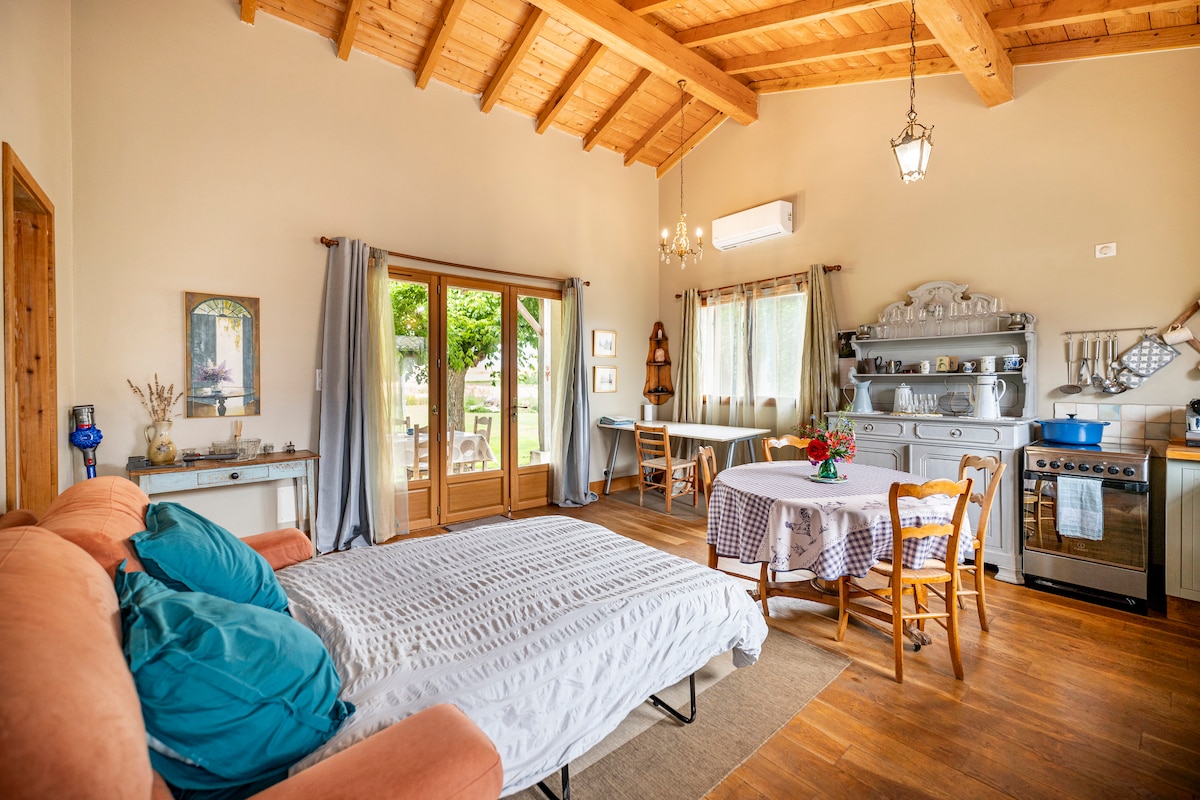 Хорошо оборудованный коттедж с одной спальней и диваном-кроватью в центре прекрасной Французской загородной местности. Рядом с Бордо, Сент-Эмилионом, Дюрасом и Дордоном. К услугам гостей бесплатный Wi-Fi и собственная терраса. Дети приветствуются. Общее пользование большим панорамным бассейном с великолепным видом на сельскую местность.