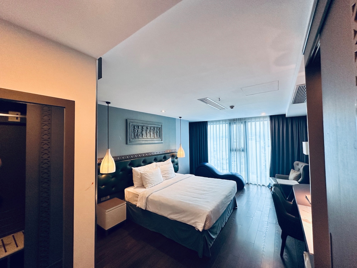 This is the choice for couple with 1 bed room and 1 living room connect to each other, and a bathroom with bathtub. Located in the buidling of Maris Hotel Nha Trang in the central, 200m to the beach where you can enjoy the vibe with restaurants, spa, pub nearby. Breakfast is included everyday from 6:30am to 9:30am at the restaurant of the hotel on the 2nd floor. You have access to the pool & gym on the 21st floor, and chill out at our public rooftop bar.