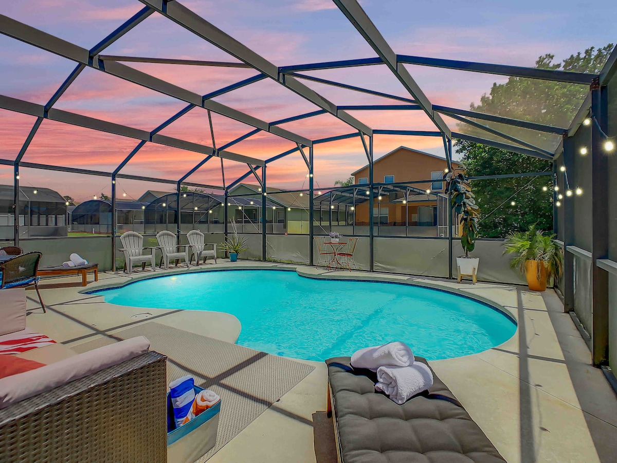 Escape to a peaceful 2,200 sq ft family retreat in a secure gated community near Disney! This spacious home comfortably fits your group with 4 bedrooms and a sleeper sofa. Unwind in your private, south-facing pool with stunning sunrise views. Features include a full game room (pool, ping pong, air hockey), two living areas, and a dedicated workspace. Perfect for families seeking relaxation and fun after a day at the parks or on the golf course.