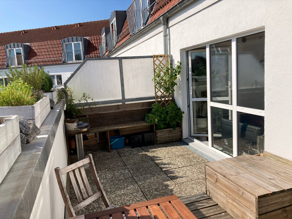 Светлая мансардная квартира на 3 этажах с солнечной террасой на крыше прямо на Кильском фьорде. Современная и полностью оборудованная квартира простирается на три этажа и имеет две гостиные, уютную спальню на верхнем этаже, две ванные комнаты и большую террасу на крыше. Всего 6 спальных мест, по две на каждом этаже.