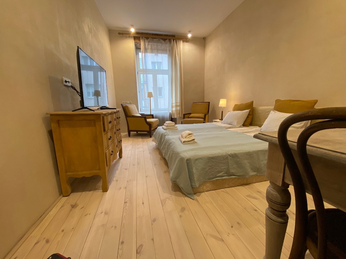 Eclectically decorated and very spacious apartment. 2 full sized bedrooms, large living room and all the modern amenities: Wifi, workspaces, smart TV/Netflix, Sound System. Fully equipped kitchen: microwave, full-sized oven, dishwasher, washing machine. Central heating: floor heating in the corridor & bathroom. Original restored all-natural wooden floors provide a cosy and relaxing atmosphere.