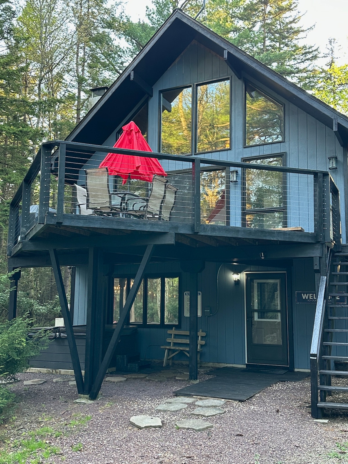 Окружайте себя видом на дом на дереве в современном шале * 12 спальных мест | Максимум 8 взрослых за бронирование. *Дети до 2 лет должны быть включены в стоимость. *Ванная комната для каждой спальни. *Идеально для нескольких поколений и групп *Зарядка для электромобиля, костровище, джакузи и игровая комната *Удаленные работники и корпоративные бронирования приветствуются. *Отдельное рабочее место с террасой, принтером и Wi-Fi. * В нескольких минутах от исторического центра Джима Торпа. *Сезонный доступ к общественному бассейну, озеру площадью 160 акров и пикболу.