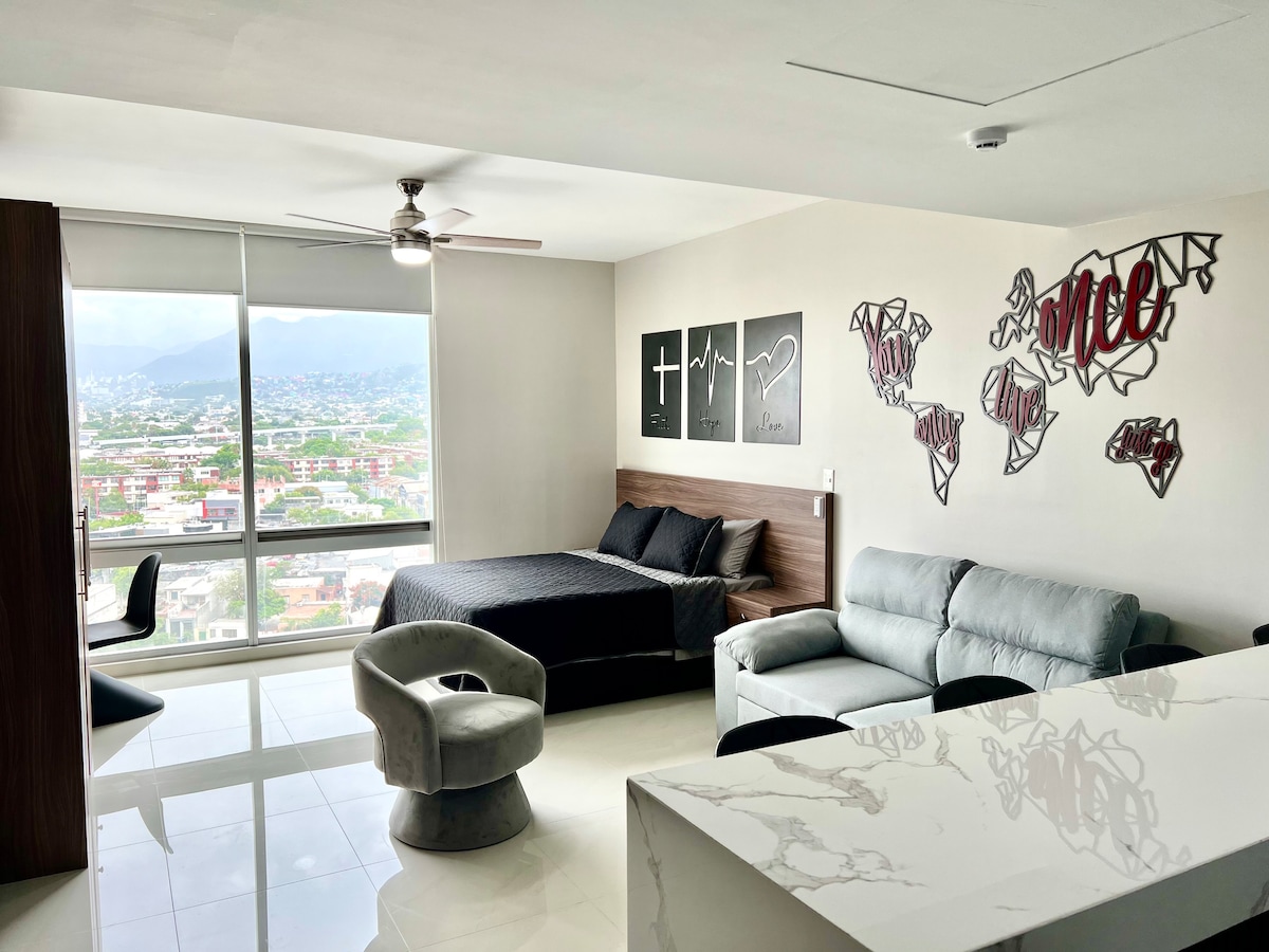 Depa tipo loft en una de las mejores ubicaciones del sur de la ciudad con una vista al maravilloso cerro de la silla, capacidad hasta para 5 personas ,cuenta con 2 Camas matrimoniales y un sofacama ind, cocina equipada, 2 balcones uno de ellos con asador, 1 cajón de estacionamiento, gimnasio, y lavandería de paga en el piso 11 ,está muy céntrico de los principales centros comerciales y tiendas de abarrotes , así como centros nocturnos y restaurantes a 10 min del centro la cd y parque fundidora.